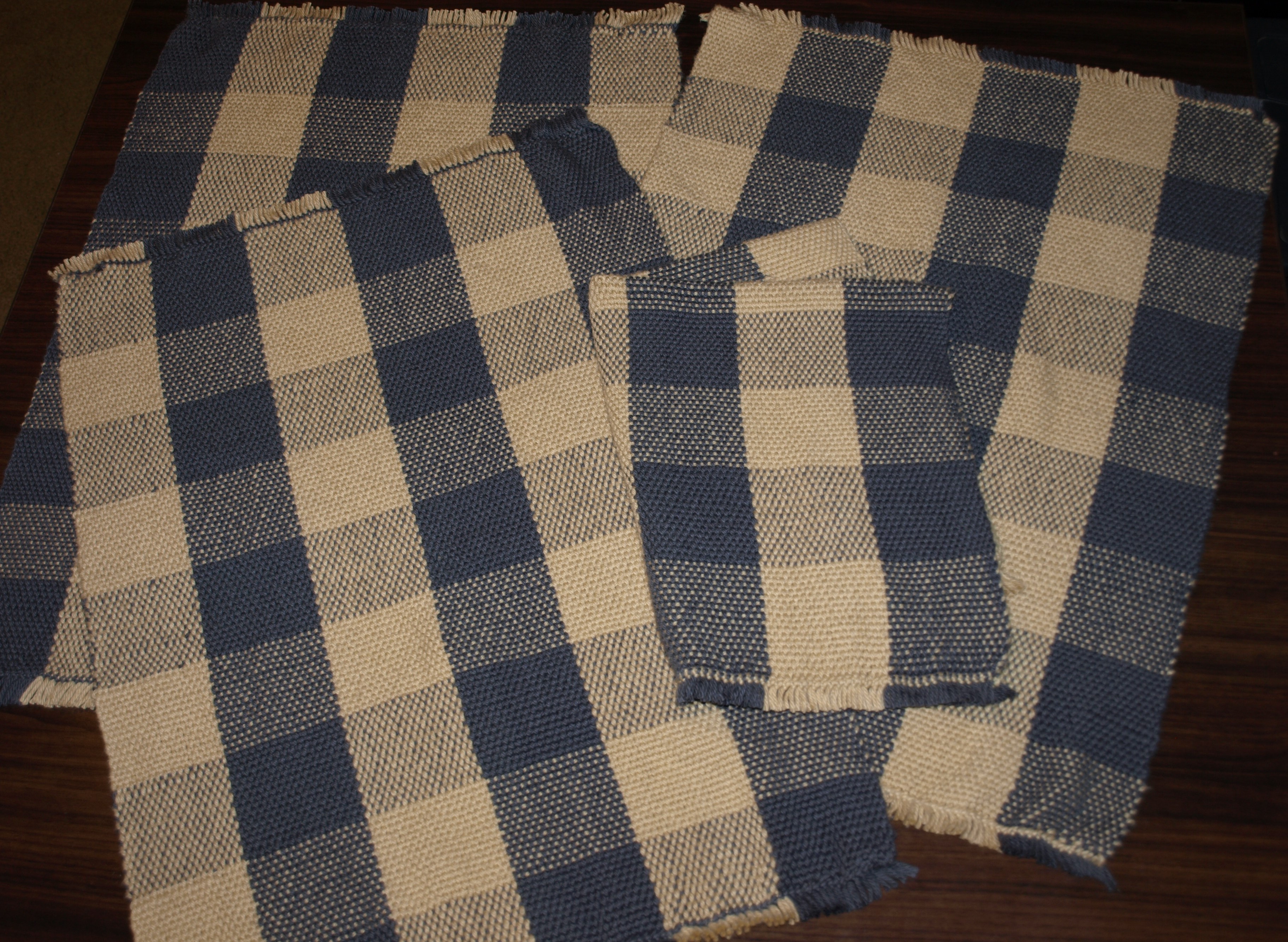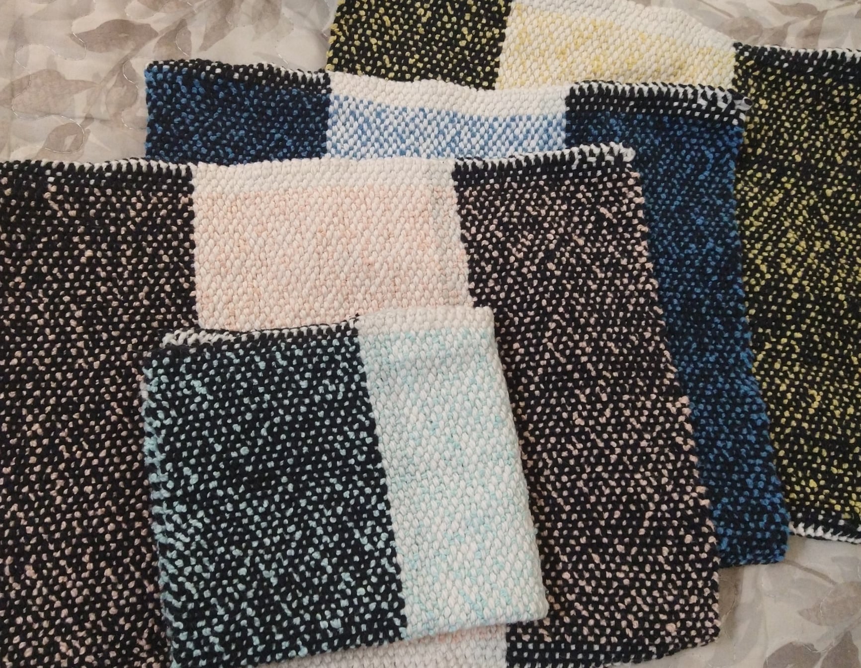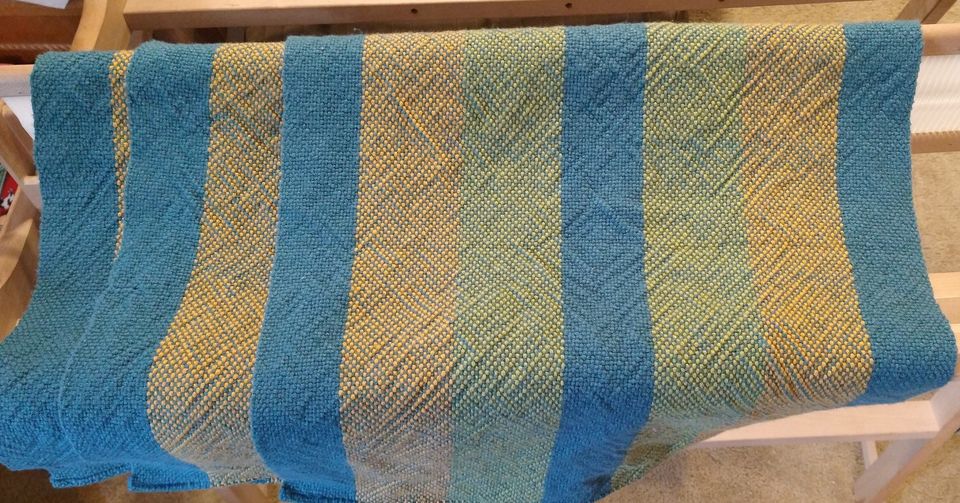 is blue, green and yellow with the weft the same blue. Each towel is hem stitched by hand and then