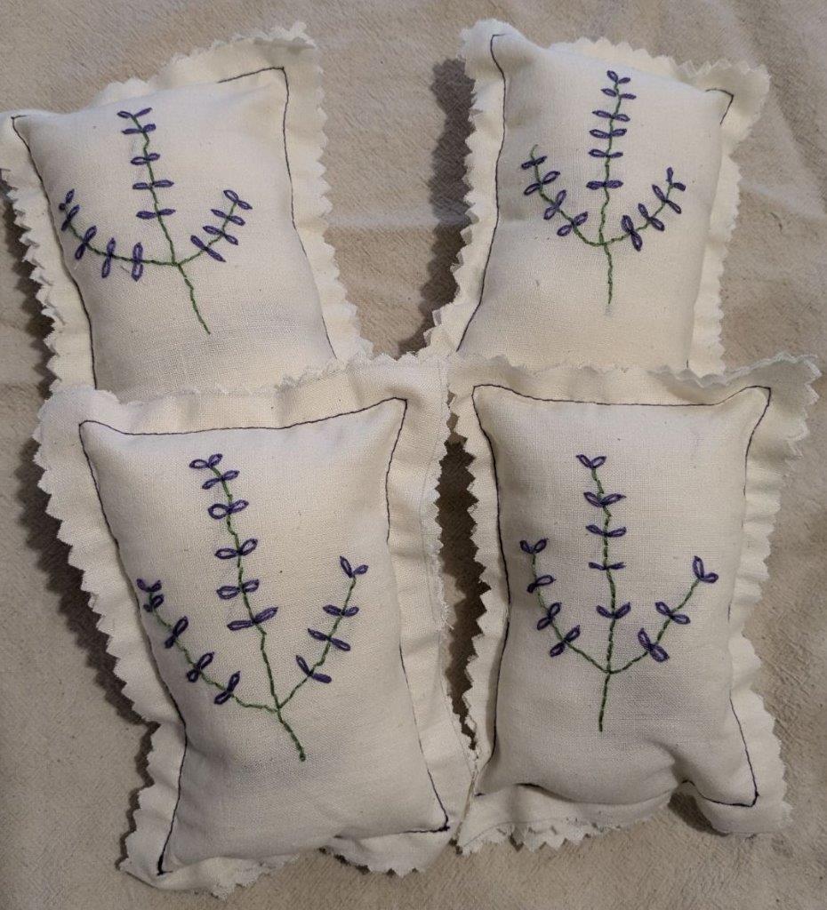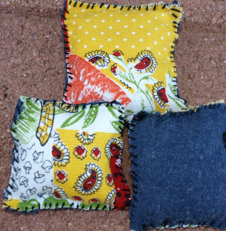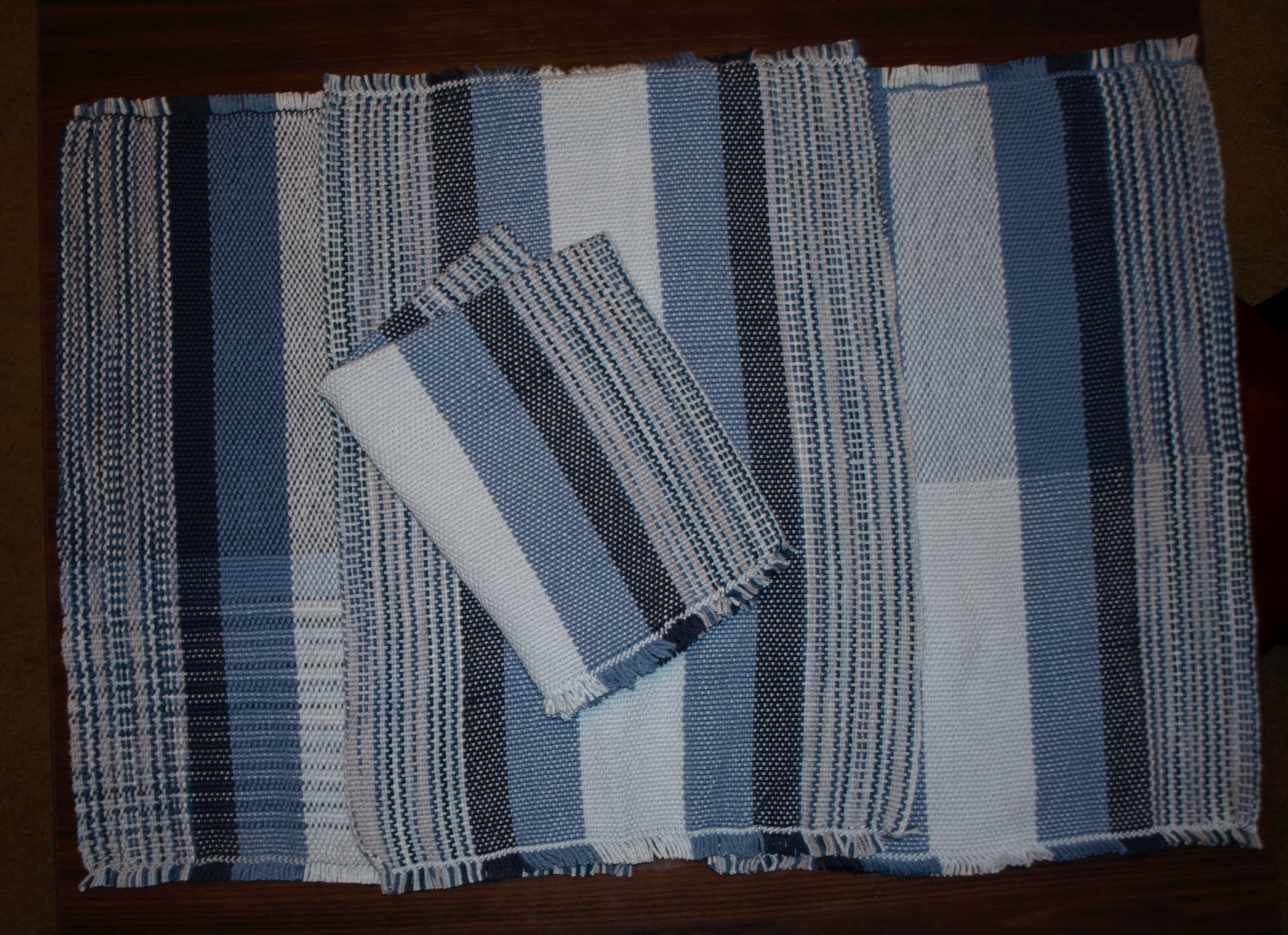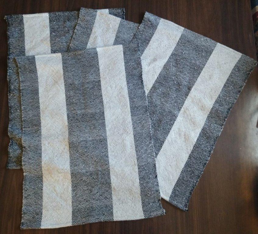 is blue, green and yellow with the weft the same blue. Each towel is hem stitched by hand and then